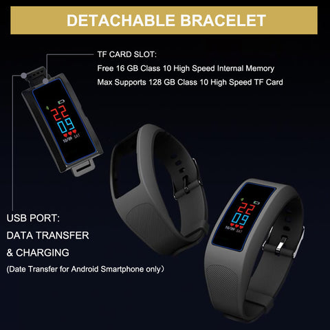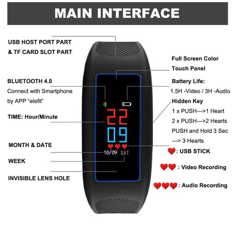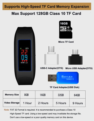 - [Max Support 128GB TF Card]: The Hidden Camera Bracelet supports large internal storage capacity to store the data files, connect to PC and SmartPhone as a USB sticker. High sensitivity 0.96 inch OLED touchscreen for easy operation, with built-in 32GB Class 10 TF card inside the Spy wristband. Built-in 260mAh battery, can support 1.5 hours Video recording, 3 hours Voice recording. over 7 days of standby for Smartwatch functions.